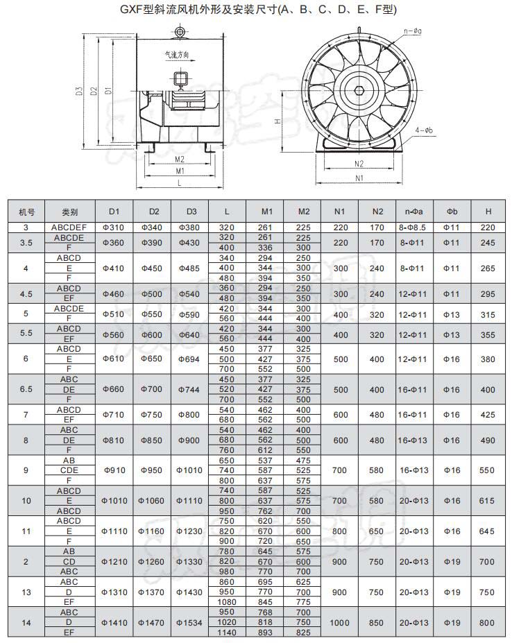 6、GXF型斜流風(fēng)機外形及安裝尺寸
