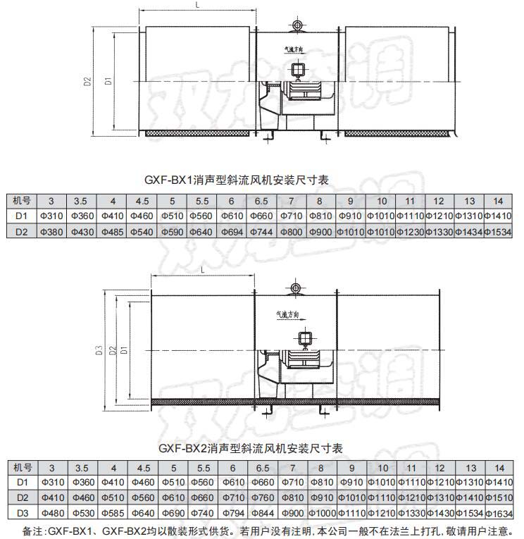 GXF-BX消聲型斜流風(fēng)機分為兩種:GXF-BX1型風(fēng)機外殼不帶消聲器,GXF-BX2型風(fēng)機外殼,進(jìn)、出風(fēng)口均帶消聲器。風(fēng)機外殼帶消聲器可消音3-5分貝;進(jìn)、出風(fēng)口各帶500mm消聲器,可消音3-8分貝;進(jìn)、出風(fēng)口各帶750mm消聲器,可消音5-11分貝;進(jìn)、出風(fēng)口各帶1000mm消聲器,可消音8-14分貝:進(jìn)、出風(fēng)口各帶2000mm消聲器,可消音11-17分貝。消聲器長度有500mm、750mm、1000mm、2000mm,用戶可根據(jù)需要自定長度。